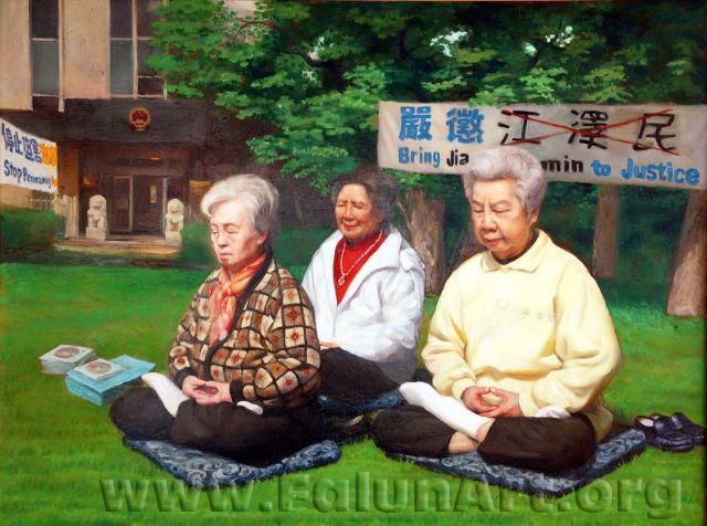 [Chanhkien.org] Bức tranh này mô tả cảnh tượng rất thân quen hằng ngày trước các toà đại sứ Trung Quốc tại hải ngoại. Những phụ nữ đă lớn tuổi này đang thiền tập Pháp Luân Đại Pháp ôn hoà trước toà đại sứ Trung Quốc tại Washington D.C và kếu gọi thế giới lên tiếng đưa Giang Trạch Dân ra trước công lý về tội trạng diệt chủng của y đối với các đệ tử Pháp Luân Đại Pháp. Cái công viên bé nhỏ trước toà đại sứ Trung Quốc tại Washington D.C được gọi là “Công viên Thiên An Môn”.