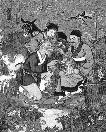 Các chuyên gia thảo mộc dạy Lý Thời Trân về các loại cây trong vùng (Bưu thiếp năm 1988, Thiên Tân, Trung Quốc)