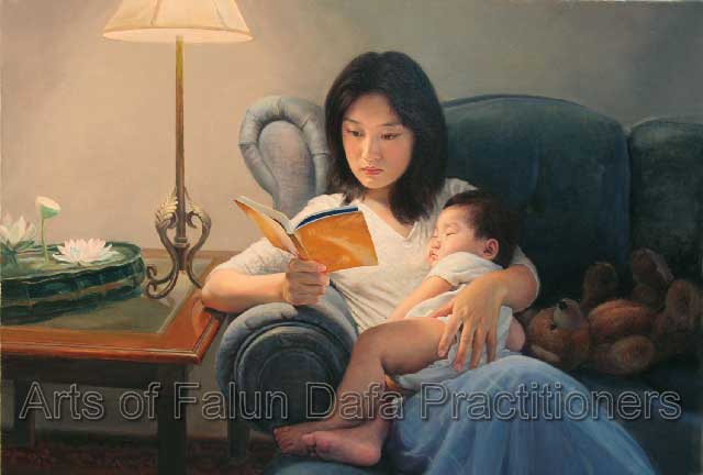 Một người tu luyện luôn luôn so sánh mình với những yêu cầu, đòi hỏi của các nguyên tắc của Pháp và luôn luôn tự nhìn vào trong và trừ dứt những khuyết điểm để nâng cao tâm tính của mình. Người mẹ trẻ trong bức tranh, trong khi bồng đứa con đang ngủ say, đã tìm thời gian để học các nguyên lý của Pháp. Điều đó nói lên rằng cô tu luyện rất tinh tấn trong khi bận rộn với công việc hằng ngày của mình. Đây chính là ưu điểm của tu luyện Pháp Luân Đại Pháp, mà không tách rời người tu luyện với xã hội. Bức tranh toả ra một bầu không khí ấm áp và thanh tịnh.