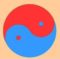 Trong đồ hình Pháp Luân có 5 biểu tượng hình chữ Vạn (srivatsa) của Phật gia. Biểu tượng chữ Vạn màu vàng kim (Hình 2) cho thấy Phật gia tu Thiện, đồng thời màu vàng kim cho người ta một cảm giác ấm áp, do vậy màu này đại biểu cho đặc tính Thiện. Sau đó, tôi tiếp tục nghĩ màu Đỏ và màu Lam thì sao? Trong đồ hình Pháp Luân, có 4 hình Thái Cực. Dù là Thái Cực của Tiên Thiên Đại Đạo (Hình 3) hay Thái Cực thông thường đều có màu Đỏ ở bên trên. Đạo gia nhấn mạnh vào tu Chân. Người Trung Quốc nói “xích thành” (ngay thật thẳng thắn, với “xích” nghĩa là màu Đỏ), “xích đảm trung tâm” (lòng dạ son sắt), tức là màu Đỏ cho người ta một cảm giác chân thành. Do vậy màu Đỏ đại biểu cho đặc tính Chân. Trong khi ấy, Nho giáo thuộc Đạo gia nhấn mạnh vào chữ Nhẫn. Phần dưới của hình Thái Cực trong Tiên Thiên Đại Đạo (Hình 3) có màu Lam, cho người ta một cảm giác tĩnh tại. Do vậy, màu Lam đại biểu cho đặc tính Nhẫn. Nếu đồ hình Thái Cực xoay nhanh, phần trên màu Đỏ và phần dưới màu Lam trộn lẫn vào nhau và xuất hiện màu Tím. Từ đó tôi nhận ra rằng Đạo gia được đại diện bởi màu Tím.