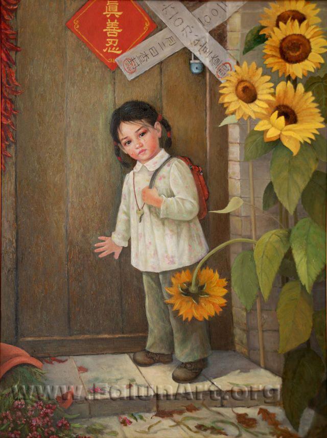 Bức tranh tiếp theo này là một câu chuyện buồn có thực và cũng rất phổ biến tại Trung Quốc. Trong bức tranh này, người họa sĩ đã sử dụng những bông hoa hướng dương để miêu tả ngôi nhà hạnh phúc của các học viên Pháp Luân Công, như được chỉ ra trên tấm biển ghi “Chân Thiện Nhẫn’. Cô bé đã về nhà từ trường và thấy rằng cửa đã bị khóa móc và niêm phong, với dòng chữ “610 tịch thu”. Phòng 610 là tên một cơ quan tương tự Gestapo tại Trung Quốc, nằm trên luật pháp và thực hiện những tội ác kinh khủng. Bông hoa rủ xuống đã tăng thêm nỗi buồn cho khung cảnh. Họa sĩ cũng nhấn mạnh lực lượng đã đi qua trước đó bằng chiếc bình vỡ và những chiếc lá nằm rải rác trên sân.