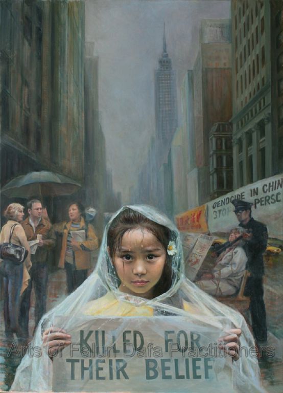 Giữa đường chân trời Manhattan và cơn mưa bất chợt, một bé gái nhỏ nhắn đang đứng phơi bày tội ác, điều dường như vượt quá tuổi của cô bé. Ánh mắt cô bé như xuyên thấu qua nền trời xám, lời thỉnh cầu về lương tâm được phản ánh rõ ràng trên tấm áp phích mà cô bé cầm. Cô bé trong tranh và nhiều người dân thành thị New York dũng cảm khác đang trong một chiến dịch kéo dài cả năm nhằm thu hút sự chú ý của mọi người và tăng cường nhận thức về sự tra tấn và giết hại các học viên Pháp Luân Công tại Trung Quốc. Hàng ngàn khách du lịch đến thành phố từ khắp nơi trên thế giới thường giúp đỡ những nỗ lực này của họ.