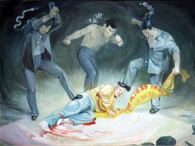 [Chanhkien.org] Hai trong số những viên cảnh sát trong bức họa ở trên đang cầm hai vỏ chai bia, cho thấy họ đã uống say trước khi bắt đầu đấm đá người học viên Pháp Luân Công đang nằm trên sàn. Viên cảnh sát thứ ba trông có vẻ tỉnh bơ với thói quen bạo lực này vì ông ta vừa hút thuốc vừa đá vào người học viên Pháp Luân Công, rõ ràng là đang bị thương nặng gây ra bởi sự tàn ác của những cảnh sát này.