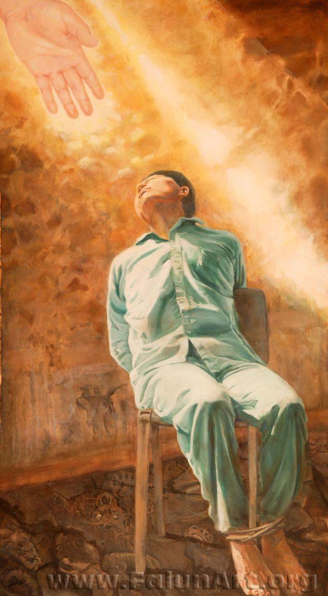 Trong bức tranh này, Lưu Thành Quân bị trói vào một cái ghế trong phòng tra tấn, nơi sàn nhà đầy những hình tượng ma quỷ và quái vật đại diện cho sự khủng khiếp mà anh phải chịu đựng khi bị giam giữ bất hợp pháp. Anh được tắm trong một luồng sáng ấm áp màu vàng kim phát ra từ góc trái, đại diện cho đức tin kiên định. Một bàn tay vàng chìa ra, đại diện cho sự cứu rỗi của vị Chủ vũ trụ. Lưu Thành Quân ngước nhìn lên luồng sáng và bàn tay, cho nên chúng ta không thấy được nét mặt anh. Những vệt máu và vết thương của anh không được thể hiện trong bức tranh này, nhưng chúng ta có thể cảm nhận từ tư thế của anh rằng anh đang chịu rất nhiều đau đớn. Anh ngước nhìn theo luồng sáng, thay vì gục đầu tuyệt vọng, điều ấy cho thấy ý chí và lòng can đảm không bị lung lay của anh.