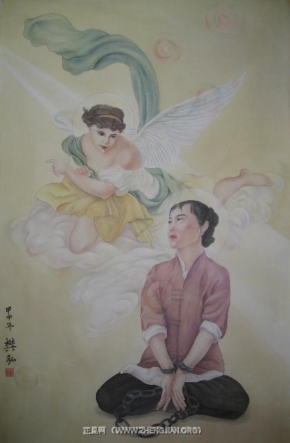 [Chanhkien.org] Lấy cảm hứng từ kinh nghiệm cá nhân khi bị giam giữ trong nhà tù Trung Quốc, Amy Lee đã sáng tác bức tranh này để bày tỏ sự quyết tâm bảo vệ các nguyên lý tu luyện Chân, Thiện, Nhẫn của các học viên Pháp Luân Công, bất chấp việc họ bị mất tự do, bị mắng chửi và ngược đãi hàng ngày trong các trại lao động cưỡng bức và nhà tù trên khắp Trung Quốc. Người nữ học viên Pháp Luân Công này không mảy may sợ hãi khi đối mặt với tra tấn. Dù tay chân đang bị còng, nhưng cô vẫn kiên định ngồi xếp bằng trong thế hoa sen. Chi tiết này cho thấy rằng cô đang ở trong tù và phải hứng chịu đủ loại tra tấn. Vẻ mặt an hòa của cô tiết lộ rằng cô đã từ chối từ bỏ đức tin ngay cả khi bị tra tấn. Một thiên thần đã đến thăm cô, ban cho cô sức mạnh và lòng can đảm để vượt qua ma nạn.