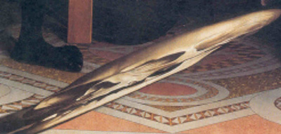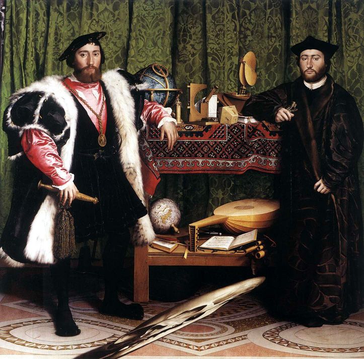 Jean de Dinteville và Georges de Selve (‘Đại sứ nước Pháp’), năm 1533, tranh sơn dầu trên gỗ sồi, 207 x 209 cm, Phòng tranh Quốc gia, London. Lưu ý cây thánh giá bạc nửa ẩn nửa hiện đằng sau tấm rèm ở tận cùng bên tay trái.