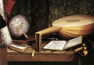 Hai người đàn ông đứng hai bên chiếc bàn với rất nhiều đồ vật liên quan tới tứ khoa (số học, hình học, thiên văn, âm nhạc), bốn môn khoa học chính thời bấy giờ. Nhưng đây không phải là tứ khoa truyền thống trong trường đại học thời Trung Cổ, mà là tứ khoa mới dựa trên kinh nghiệm thực tiễn và sự thực hành.