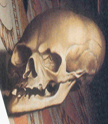 Chiếc đầu lâu được vẽ theo cách như vậy để phù hợp với hình dáng khi nhìn lệch từ bên phải, vì người xem có thể vô ý nhìn từ góc dưới bên phải khi bức tranh được treo trên tường, do vậy chiều cao của chiếc đầu lâu là khá nhỏ.