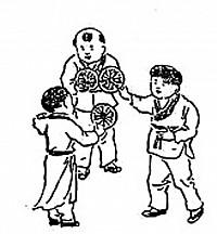 Trước hết nhìn vào gợi ý ở đồ hình. Bức hình vẽ ba hài tử hoặc thiếu niên mặc cổ trang, đứng thành vòng tròn, mỗi người cầm trên tay một vật có dạng bánh xe (luân tử), trông giống bánh xe đang quay (phi luân). Mỗi người cầm bánh xe đều đưa tay về phía trước. Trông như mấy đứa bé đang chơi đùa, cũng giống như mỗi người cầm luân tử đang bận làm điều gì đó.