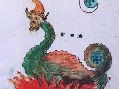Điều khiến người ta kinh ngạc hơn nữa chính là bức tranh miêu tả sinh vật mình rồng đầu người đang bị lửa thiêu đốt, nhìn rất giống với “ác long” của phương Đông. Con rồng Tây phương và con rồng Đông phương có sự khác biệt rất lớn, ở đây Nostradamus đặc biệt chọn dùng hình dạng con rồng phương Đông. Thân con rồng màu xanh, cùng màu với trang phục binh sĩ ĐCSTQ, trên mình con rồng lộ ra một cảnh tượng với các kiến trúc tương tự với quảng trường Thiên An Môn tại Bắc Kinh.