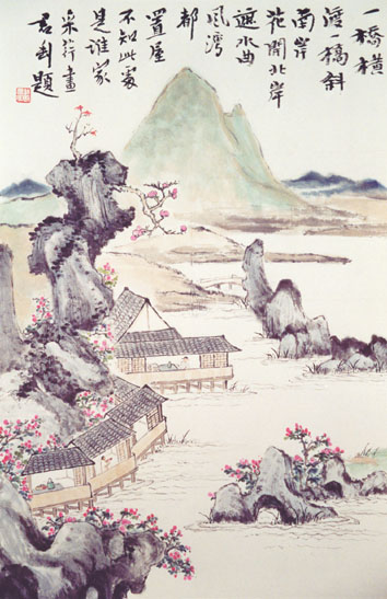 [Chanhkien.org] Phong cảnh ao hồ và sông núi là những chủ đề được ưa thích trong hội họa Trung Quốc. Chỉ trong không gian giới hạn của bức tranh này, họa sĩ đã miêu tả được ba lớp cảnh quan chính: Những ngọn núi xanh xám ở đằng xa, ngọn núi xanh tươi ở ngay gần, và ngôi làng nhỏ ven hồ ở cận cảnh.