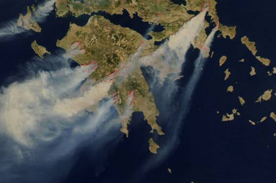 Ảnh: Ảnh chụp từ trên không vùng bán đảo Peloponnese của Hy Lạp phát sinh cháy rừng, ngày 25 tháng 8 năm 2007.