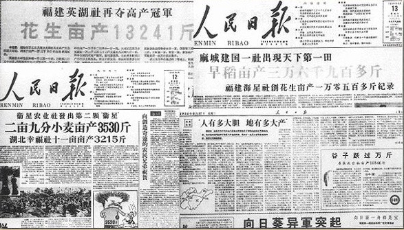 Trong cuộc vận động hoang đường “đại nhảy vọt” này, các nơi trên toàn quốc đua nhau phóng “vệ tinh nông nghiệp”, báo cáo giả sản lượng lương thực, với sản lượng lên tới cả ngàn cân, vạn cân, v.v. Trên thực tế không ở đâu có lương thực nhiều thế, đều toàn là giả, đến mức không ai dám nói thật nữa. Kết quả chỉ tiêu trưng thu lương thực được đặt ra rất cao, tới mức lấy hết cả khẩu phần lương thực của quần chúng. Quần chúng bị đoạt hết lương thực rồi thì chỉ có thể chết đói, đây chính là nguyên nhân gây ra nạn đói lớn quét sạch toàn quốc.