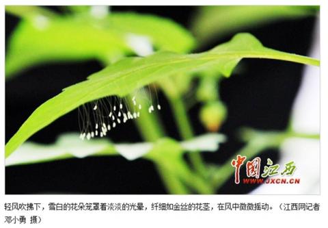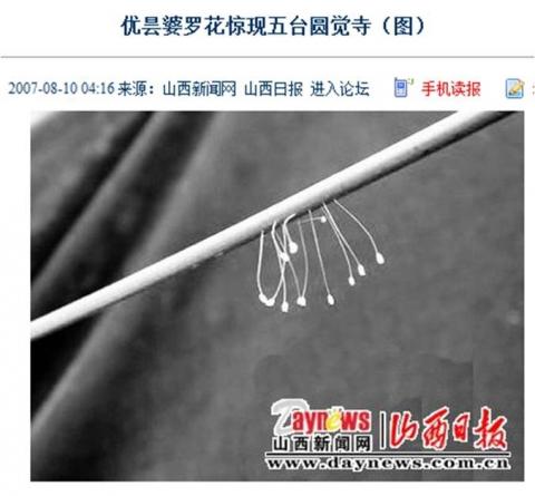 Ngày 18 tháng 5, ông Dư trong Ủy ban thành phố Nam Xương, tỉnh Giang Tây đã gọi điện cho Tin tức Giang Tây, nói rằng trên lá cây nho ở nhà ông đã xuất hiện “Ưu Đàm Bà La hoa”. Phóng viên đã tới tận nơi điều tra và phát hiện rằng tại nhà ông Dư, trên lá cây nho cao 1 mét có mấy bông “hoa nhỏ màu trắng”. Những bông hoa này trắng tinh, cuống hoa dài 2 cm, trên mỗi cuống hoa dày chưa đến 1 mm đều có “nhị hoa”, lớn cỡ hạt vừng. Khi dùng tay ấn nhẹ vào những bông hoa nhỏ màu trắng này thì người ta phát hiện thấy hoa rất mềm mại và có tính đàn hồi.