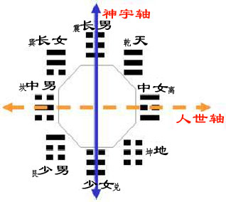 Nói cụ thể, “Vị lai Bát quái phương vị” phản ánh cảnh tượng “nhân Thần quy vị” như thế nào? Ở đây, trên thực tế chúng ta đã tiến hành định nghĩa lại mới sáu vị trí nhân luân. ‘Trưởng giả’ {người cả} trong nhân luân, bao gồm trưởng nam, trưởng nữ, cũng chính là điều mà Lão Tử gọi là “thượng sỹ”; thượng sỹ nghe Đạo để rồi đắc Pháp tu luyện, do đó họ là có quả vị trong tương lai. Trưởng nam {quẻ Chấn (☳)} là thuần Dương, nhưng ở đây không hề đại biểu nam trong nam-nữ, mà đại biểu cho nhóm những người tu luyện tốt nhất. Quả vị trong tương lai của họ là vượt quá vị trí của Trời (vị trí quẻ Càn (☰) ở đây đại biểu cho một loại vị trí tham chiếu trong vũ trụ), có thể đạt tới cực của vũ trụ (trên cùng của “Thần vũ trục”), so với Trời (quẻ Càn) còn cao hơn. Loại quả vị này là vĩnh hằng; vũ trụ là bất diệt, quả vị cũng bất diệt. Đây là một loại kết cục ở vị trí tối cao nhất, tốt nhất. Tôi cần phải thuyết minh một chút ở đây, đó là chỉ có đến lúc này, chúng ta mới có thể lĩnh hội tương đối đầy đủ ngụ ý chân chính của “Thần trục” hoặc “Thần vũ trục”.