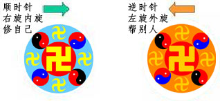 Vậy thì rốt cuộc biến động như thế nào? Biến động của vũ trụ phản ánh ra sao trong biến đổi của Bát quái phương vị? Ban đầu tôi đã nghiên cứu gợi ý từ câu nói trong «Chuyển Pháp Luân», “Xoáy vào (thuận chiều kim đồng hồ) độ bản thân, xoáy ra (ngược chiều kim đồng hồ) độ nhân“, xin xem Hình 13. Pháp Luân xoáy vào (thuận chiều kim đồng hồ) đại biểu cho độ bản thân, hướng vào trong, tu luyện tự kỷ, yêu cầu tự kỷ, cải biến tự kỷ, đề cao tâm tính, đề thăng, trở về vũ trụ, phản bổn quy chân, v.v. Pháp Luân xoáy ra (ngược chiều kim đồng hồ) độ nhân, hướng ra ngoài, cứu người, hành động, cải biến thế giới, yêu cầu người khác, chỉ huy người khác, hạ xuống nhân gian, v.v. Để biết nội dung chi tiết, xin mời quý độc giả tìm đọc cuốn «Chuyển Pháp Luân» của Lý Hồng Chí Tiên sinh. Ý nghĩa của việc Pháp Luân chuyển động thuận chiều kim đồng hồ và ngược chiều kim đồng hồ đã gợi mở cho tôi. Nếu như vũ trụ lớn biến động, thì phản ánh như thế nào lên Bát quái phương vị? Ở trên chúng ta đã phân tích hai trục trong “Tiên thiên Bát quái”, như vậy đại biến động của vũ trụ nhất định sẽ phản ánh lên chuyển động của “nhân trục” và “Thần trục”. Vũ trụ phải biến động, mục đích là cải biến vũ trụ, là hành động, là cần cứu độ, là “Thiên nhân đi xuống”, do đó “Thần trục” phải xoay chuyển ngược chiều kim đồng hồ. Khi ấy tôi chính là nghĩ như vậy. Nhưng hiện tại tôi cho rằng, biến hóa từ “Tiên thiên Bát quái phương vị” sang “Hậu thiên Bát quái phương vị” là do Thần trục động, bởi vì Thiên nhân đi xuống. Bởi vì Thần trục động, nên nhất định phải khiến nhân trục hoán vị, nhân trục ở đây chỉ là động theo. Nhưng nhân trục động, chính là phản bổn quy chân; đây là nguyên nhân biến động từ “Hậu thiên Bát quái” sang “Vị lai Bát quái”.