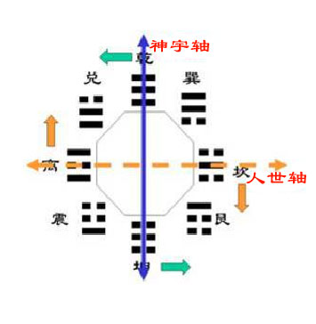 “Thần trục” và “nhân trục” hoán vị cho nhau, đây là nguyên lý biến hóa thứ nhất để suy luận “Hậu thiên Bát quái phương vị”. Phản ánh chính là sự kiện trọng đại “Thiên nhân đi xuống” trong vũ trụ. Cũng là nói rằng, đại biến động của vũ trụ trước tiên phản ánh ở sự đổi chỗ giữa “Thần trục” và “nhân trục” trong “Bát quái phương vị đồ”. Thông qua đổi chỗ giữa “Thần trục” và “nhân trục” (Hình 14), chúng ta được trạng thái quá độ thứ nhất từ “Tiên thiên Bát quái phương vị” sang “Hậu thiên Bát quái phương vị”, như thể hiện ở Hình 15.