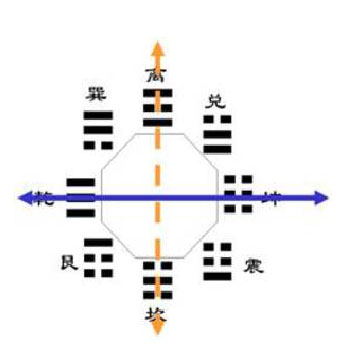 Trước tiên chúng ta đem phương pháp phân trục hình chữ thập áp dụng vào “Tiên thiên Bát quái phương vị” của Phục Hy. Như vậy chúng ta được Hình 12. Hai quẻ Càn (☰), Khôn (☷) {Thiên, Địa} nằm trên ‘Thần vũ trục’. Bởi vì như chúng ta biết, nếu như đem Bát quái kết hợp với Ngũ hành, thì trung ương của Ngũ hành là Thổ, Thổ vượng tứ phương, trung ương là Thổ. Thổ cũng đại biểu cho người, văn hóa Trung Quốc “lấy Thổ làm tôn”, người sống trên đất, do vậy mới gọi là “Trung Thổ”. Bởi vì trung ương là người, cho nên “Thần vũ trục” cũng ẩn hàm quan hệ Thiên-Địa-nhân. Còn “nhân trục” nằm ngang triển khai thành Khảm (☵), Ly (☲) {Thủy, Hỏa}, đại biểu hai chủng vật chất không thể ly khai tại thế gian nhân loại; do đó hai quẻ Khảm, Ly đại biểu nhân loại, đại biểu “nhân thế trục” triển khai theo chiều ngang. Hình 12 chính là quan hệ giữa “Tiên thiên Bát quái” và trục hình chữ thập. Như vậy chúng ta đã chuẩn bị tiền đề để nghiên cứu biến hóa của Bát quái.