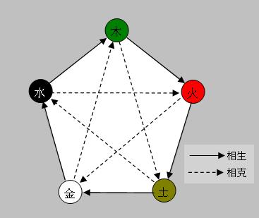 Hình 1: Ngũ hành tương sinh-tương khắc. Mũi tên nét liền là quan hệ tương sinh, mũi tên nét đứt là quan hệ tương khắc. Thứ tự từ trên xuống dưới theo chiều kim đồng hồ là Mộc→Hỏa→Thổ→Kim→Thủy.