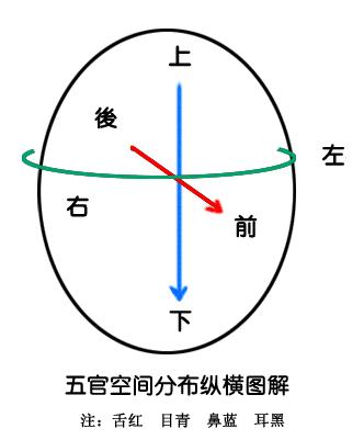 Thật là kỳ diệu! Dương ngoại hóa, Âm nội thu. Công năng của ngũ tạng mà Trung y giảng, kỳ thực là hỗn hợp Âm-Dương tạo thành. Hai tạng huyết, một hóa (Dương) một tàng (Âm); hai tạng khí, một hóa (Dương) một nạp (Âm). Trạng thái Âm-Dương liệt kê trong biểu trên thực ra chỉ là nhìn từ một tầng diện. Từ một tầng diện khác, toàn bộ ngũ tạng là do Âm hóa sinh, toàn bộ lục phủ là do Dương hóa sinh. Tuy nhiên dù thế nào đi nữa, thân thể người đều nghiêm khắc chiểu theo quy luật Âm-Dương mà tiến hành diễn hóa phức tạp. Đây là nhìn từ góc độ công năng của ngũ tạng, tiếp đây chúng ta sẽ từ hình thái hoặc khí chất để nhìn. Trước hết nói về ngũ quan. Dương hư Âm thực, hai khiếu khí (mũi và tai) trống rỗng, hai khiếu huyết (mắt và lưỡi) lại là thực thể. Dương dọc Âm ngang, hai khiếu khí (mũi và tai) mọc theo hướng dọc, hai khiếu huyết (mắt và lưỡi) mọc theo hướng ngang. Điều kỳ diệu nhất chính là trong hai khiếu khí nằm dọc, một khiếu nằm ở trước sau trung tuyến (mũi), một khiếu nằm ở trái phải trung tuyến (tai). Còn hai khiếu huyết nằm ngang, một là hướng trước sau (lưỡi), một là hướng trái phải (mắt), hơn nữa các khiếu còn đan xen ngang dọc, phương hướng cũng bất đồng, xin xem hình dưới: