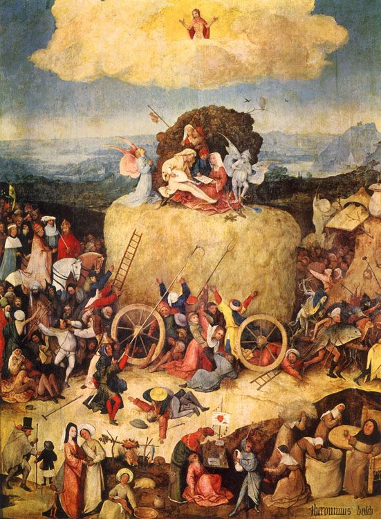 * Tác phẩm bộ ba “Cỗ xe chở cỏ khô” (Haywain) của họa sĩ Hieronymus Bosch (1485-90) (Hình 18): Cỏ khô ẩn dụ danh lợi và dục vọng trên thế gian là tạm thời ngắn ngủi, dễ dàng bị mục rữa mà trở thành vô giá trị; tuy nhiên người ta không từ một thủ đoạn nào để mù quáng truy cầu nó… Truy cầu vật dục của con người chính đang bị ma quỷ lợi dụng, từ đó dẫn con người đi theo hướng tội ác.