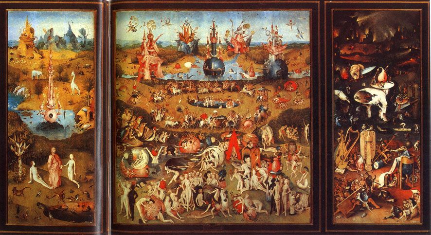 * Tác phẩm bộ ba “Khu vườn hưởng lạc trần tục” (The Garden of Earthly Delights) của Hieronymus Bosch (1504) (Hình 19) miêu tả tội tổ tông của nhân loại và quá trình buông thả sa ngã của con người.