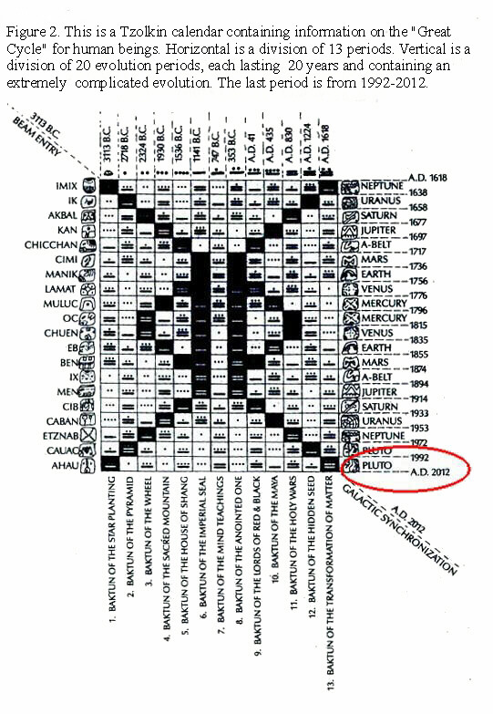 Người Maya tin rằng các hành tinh trong Thái Dương hệ, sau khi chịu ảnh hưởng của xạ tuyến ngân hà trong “đại chu kỳ”, sẽ phát sinh biến hóa về căn bản, gọi là “đồng bộ với hệ Ngân Hà” (Galatic Synchronization). Theo cách tính của người Maya, “đại chu kỳ” này lại phân thành 13 giai đoạn (Baktun), và diễn hóa của mỗi giai đoạn đều được ghi lại rất đầy đủ. Trong cuốn sách “Hiệu ứng Maya”, tiến sĩ Arguelles đã dùng một lượng lớn hình vẽ để thuyết minh tình huống diễn hóa mỗi giai đoạn này, lại phân mỗi giai đoạn thành 20 thời kỳ diễn hóa (Unial). Mỗi thời kỳ này kéo dài khoảng 20 năm.