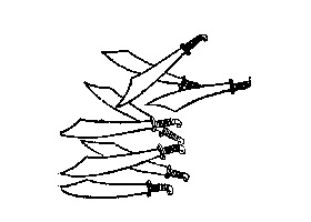 [Chanhkien.org] Trong bức họa là tám cây đao, cây đao thứ ba từ trên xuống có lưỡi đao hướng lên trên, ám chỉ nước Mỹ không đồng ý phân chia Trung Quốc.