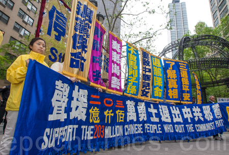 Ngày 15 tháng 05 năm 2015, khoảng 8.000 học viên tập hợp tại gần khu vục LHQ tại New York để ủng hộ hơn 200 triệu người Hoa đã thoái xuất khỏi các tổ chức của Đảng cộng sản Trung Quốc.