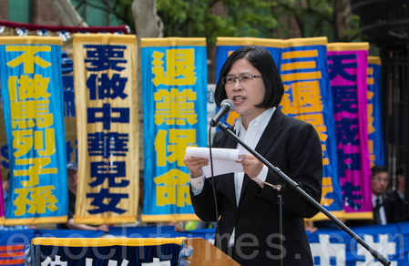 Người phát biểu: bà Dịch Dung – Chủ tịch trung tâm phục vụ thoái đảng toàn cầu.