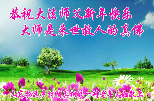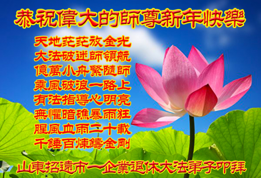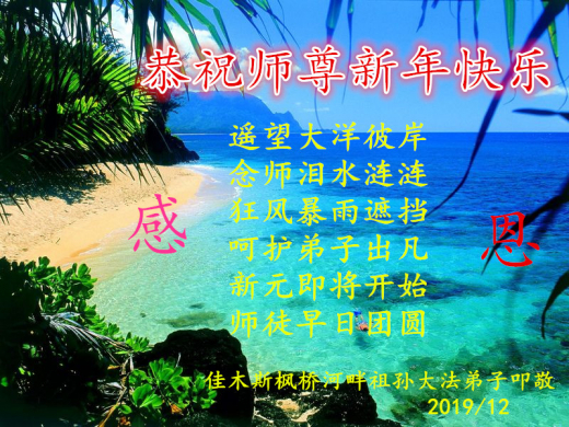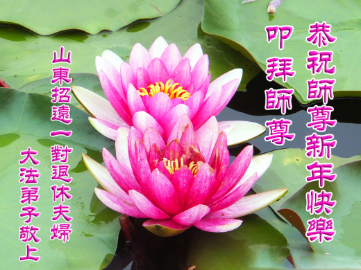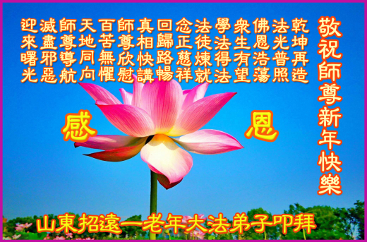 Hoa tuyết múa may, trời đông hoa mai nở rộ, áo bông sưởi ấm căn phòng, nhu hòa khoan lễ, nói cười hoan hô, trong tháng Chạp chúng con nghênh đón tết Dương lịch năm 2020 cùng tết Âm lịch truyền thống. Tại thời khắc vạn vật đổi mới này, xin cho phép đệ tử gửi lời chúc tết tới Sư phụ: Cung chúc Sư phụ năm mới vui vẻ! Vạn sự như ý! Tâm tưởng sự thành! Cảm tạ Sư phụ Chính Pháp! Cảm tạ Sư phụ cứu độ chúng sinh! Đệ tử Đại Pháp tỉnh Sơn Đông bái lạy Ngài!