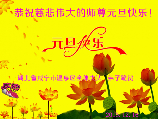 Toàn thể đệ tử Đại Pháp thuộc địa khu Ôn Tuyền, thành phố Hàm Ninh, tỉnh Hồ Bắc cung chúc Sư tôn từ bi vĩ đại năm mới vui vẻ!