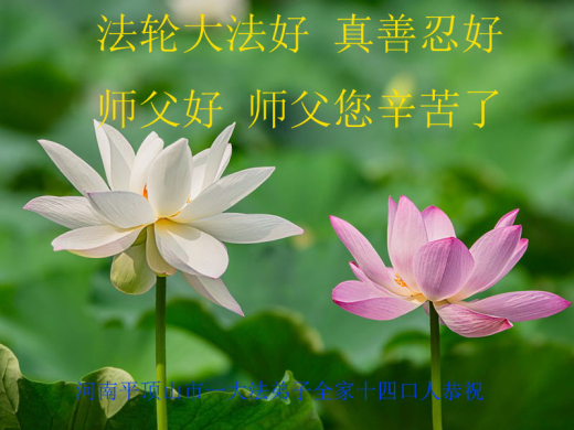 Chúng con đều từng đi qua từ khi Đại Pháp khai truyền đến khi tà đảng điên cuồng bức hại, rồi lại tới khi Đại Pháp hồng truyền thế giới. Trong tu luyện có niềm vui của việc đề cao tâm tính, có thống khổ khi xả bỏ nhân tâm. Trong khó nạn, trong khốn khổ, chúng con có Pháp soi đèn trong tâm, có Sư phụ thời thời bảo hộ. Một đường đi tới hôm nay, trong tâm chúng con hiện nay càng sáng tỏ, biết rõ sứ mệnh của mình, càng minh bạch con đường cần đi tới tương lai là nên đi như thế nào. Đệ tử chúng con xin cảm ân Sư tôn mọi thời khắc luôn bảo hộ và từ bi khổ độ, chúng con cảm ân Sư tôn đã cứu độ vô lượng chúng sinh trong toàn vũ trụ! Phật ân hạo đãng!