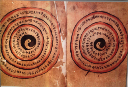 Hình 7: Trong quyển kinh thư cổ của dân tộc Di “Sự khởi đầu của vạn vật”, khí trong của “Ngải Phổ” tạo thành Mễ Cổ Lỗ trắng và khí đục của “Ngải Phổ” tạo thành Mí A Ná màu đen. Đây là hình mẫu nguyên sơ nhất của “Thái Cực”.