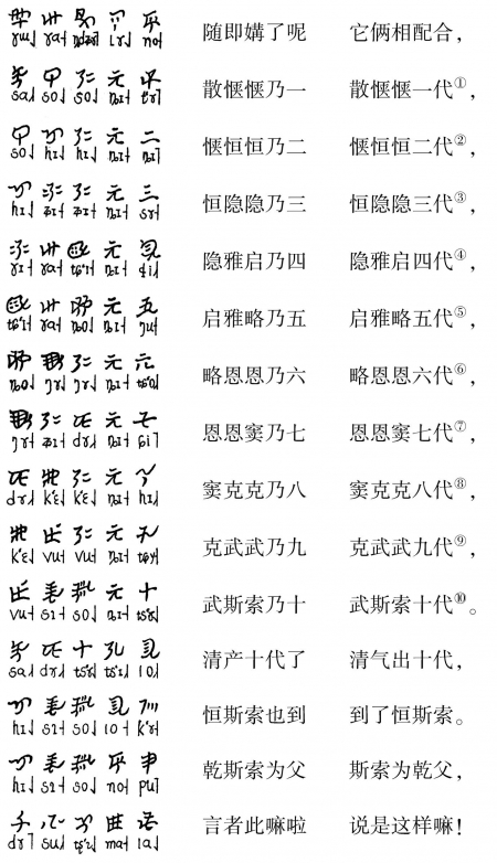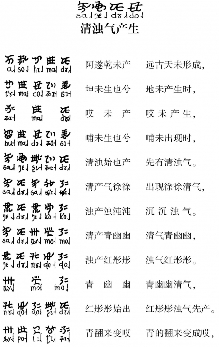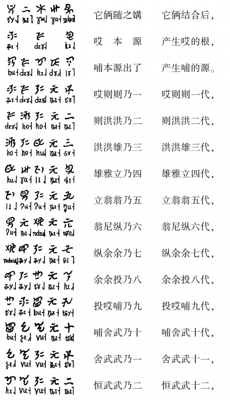 Mọi người có thể thấy, gia phả này dùng phương thức trần thuật mộc mạc để kể lại, về những sinh mệnh thể tối nguyên sơ “thanh khí” và “trọc khí” thì họ chỉ tường thuật rất đơn giản hành vi và lịch sử của họ, ghi lại tên gọi của từng thế hệ, cũng không bình luận hay giải thích gì thêm. Cách kể chuyện này xuyên suốt toàn bộ bản gia phả, đó chính là thái độ rất lý trí và nghiêm túc của một nhà biên sử. Chúng ta hãy xem nội dung, sinh mệnh tối nguyên sơ ban đầu là dạng khí, được gọi là “thanh khí” và “trọc khí”, khi chúng phối hợp cùng nhau, mỗi loại khí lại tự sáng tạo ra mười đời sinh mệnh, mỗi đời sinh mệnh đều được ghi lại tên gọi, theo cách đời sau nối tên đời trước, tức là tên của cha là họ của con. Đến đời thứ mười của thanh khí là “Hằng Tư Sách” thì “Càn Phụ” (cha trời) cũng được hình thành; Đến đời thứ mười của trọc khí là “Đầu A Vũ” thì “Khôn Mẫu” (mẹ đất) được hình thành. Lúc này, sinh mệnh bắt đầu biến đổi thành hai loại vật chất là “Ngải” (哎) và “Bộ” (哺), tức là “Âm và Dương”. Từ thời điểm này, vũ trụ bắt đầu sinh sôi tạo ra nhiều sinh mệnh (Hình 1).