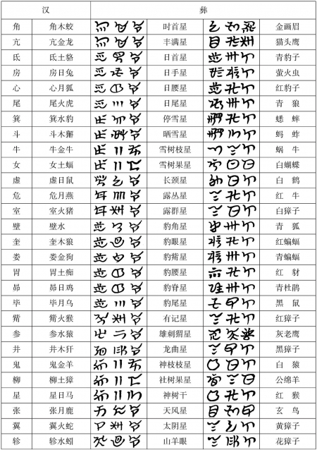 Hình 8: Bảng đối chiếu 28 chòm sao tiếng Di và tiếng Hán