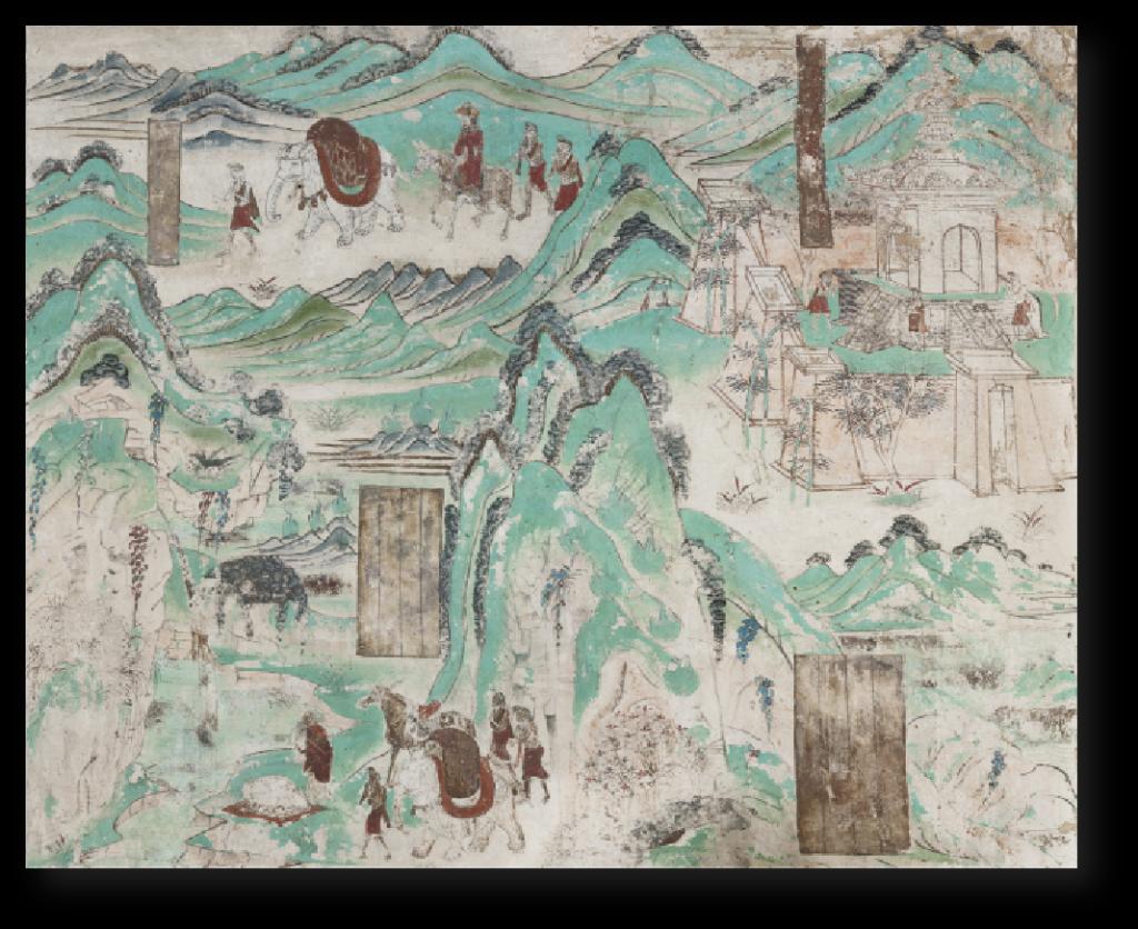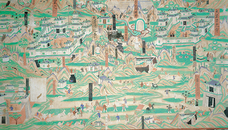 Bức tường phía Tây – Cảnh núi Ngũ Đài, chùa Thanh Lương và cổng núi Hà Đông Đạo phía Tây Nam trong hang động số 61 (Nguồn: Dunhuang Academy)