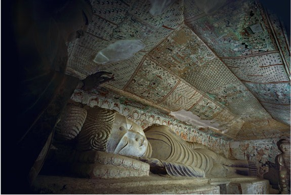 Ngoài ra, còn có bức tượng Phật Thích Ca trong tư thế nằm (nghiêng về phía bên phải) dài 15.8m trong hang động số 158 được xây dựng vào giữa thời nhà Đường. Bốn bên xung quanh bức tượng còn có nhiều bức bích họa vẽ hình Bồ Tát, đệ tử, hộ pháp, quốc vương, đại thần. Dưới sự kết hợp của điêu khắc và bích họa, cảnh tượng Đức Phật nhập niết bàn được miêu tả hết sức tráng lệ và bi ai thể hiện được sự sùng bái và kính ngưỡng cao độ từ nội tâm của con người đối với Phật.
