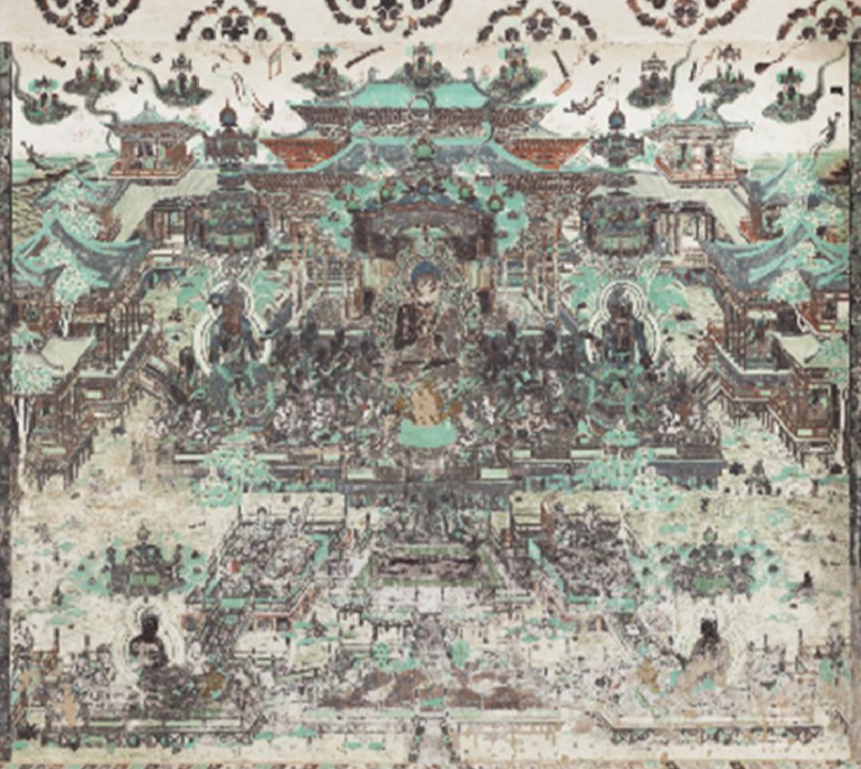 Bức tranh Phật Di Đà thuyết pháp trong động số 148 còn khắc họa được cảnh tượng mỹ diệu nơi thế giới của Phật Di Đà (Nguồn: Dunhuang Academy)