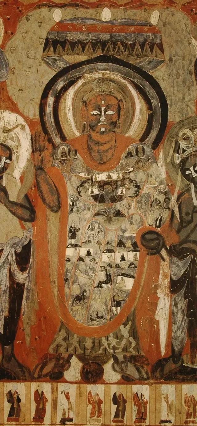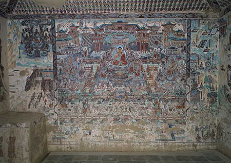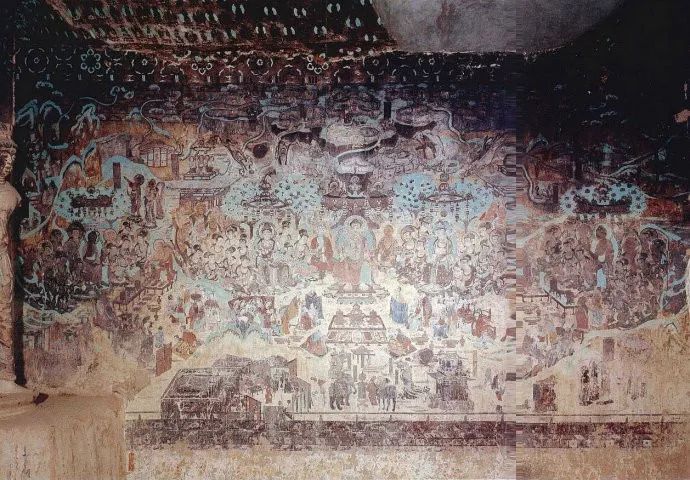 Trong thời kỳ thái bình thịnh trị nhà Đường, đời sống người dân rất đầy đủ, nhà nhà người người đều tín ngưỡng Phật, hơn nữa là văn hóa đa Phật. Mọi người mong mỏi “mùa màng bội thu” và thế giới của Phật Di Lặc “y phục tự nhiên” có trên cây, họ tin rằng mọi khổ đau đều có thể được giải trừ miễn là kiên trì niệm danh hiệu của Đức Phật Dược Sư. Vô luận phú quý sang bần, nếu một lòng niệm Phật thì kẻ phàm phu cũng đều được thoát tục mà sinh về Tây Phương. Năng lực sáng tạo của nh”ững họa sĩ có thành tín với Phật đã được phát huy cao độ. Họ đã đem những phú quý vinh hoa nơi thế gian mà gửi gắm lên những bức tranh tường, lại đem sự mỹ hảo của thế giới thiên quốc mà triển hiện nơi nhân gian. Thiên thượng cõi nhân gian, nhân gian nơi thiên tượng, đúng là là một thời kỳ thiên nhân hợp nhất, thể hiện được đầy đủ văn hóa bán thần của Trung Hoa.