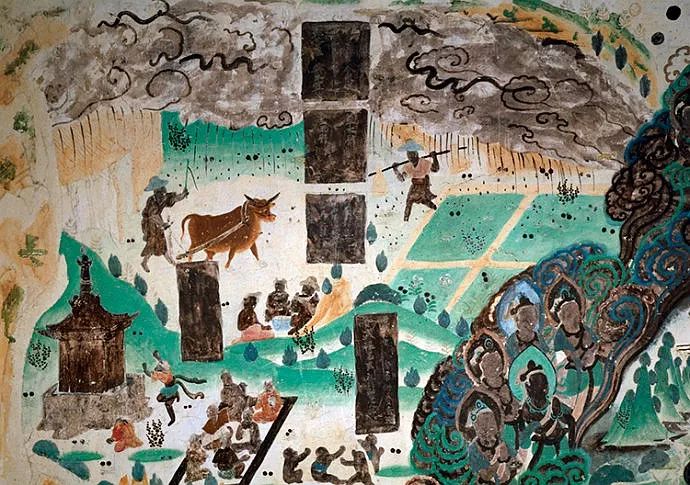 Bức tranh canh tác trong hang số 445 đã vẽ nên cảnh gieo hạt, thu hoạch, vận chuyển, lên đồng, nghỉ giữa vụ cho đến cảnh tượng nhập kho thóc. (Nguồn: Sohu và Dunhuang Academy)