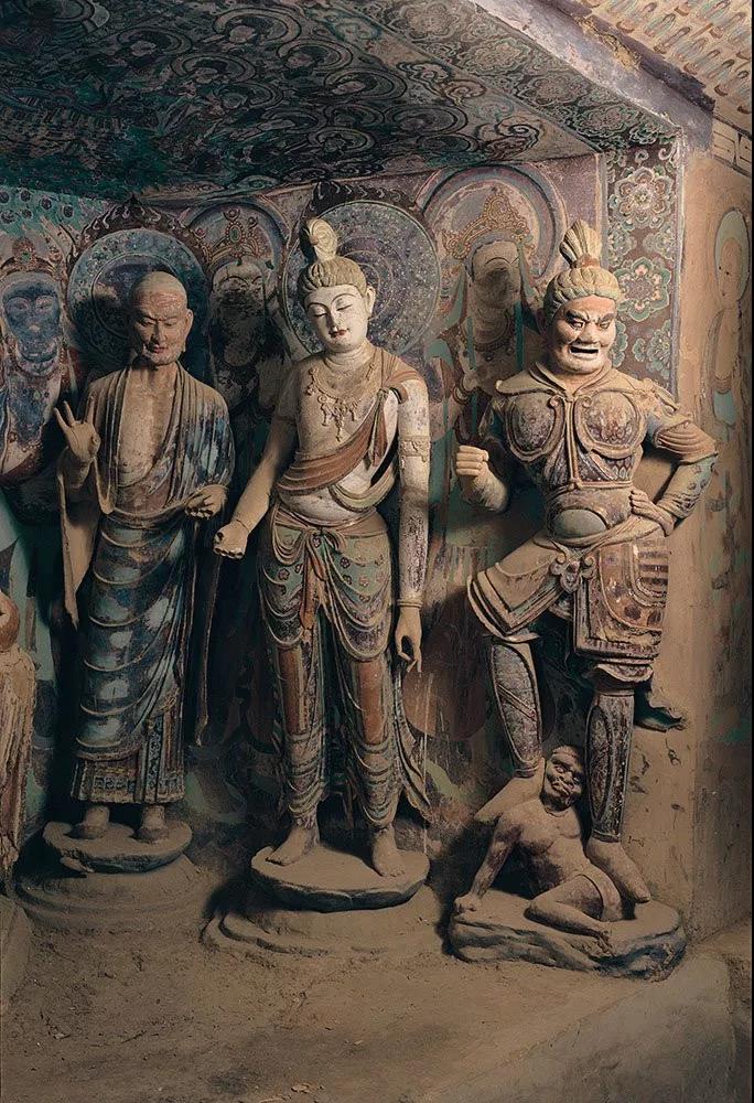 Một phần bức hình – Từ trái sang: tượng Thiên Vương, Bồ Tát, A Nan – hang động số 45 (Nguồn: The International Jin-Gang-Dhyana Association Net)