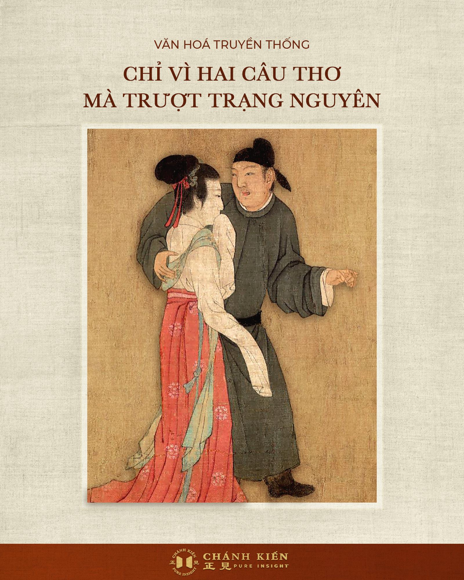 Chàng còn chưa kịp ngâm hết bài thơ thì đã đến bờ bên kia suối. Cô gái tuột xuống khỏi lưng vị thư sinh, ngâm tiếp theo hai câu thơ của chàng: “Chỉ nhân thi lưỡng cú, đoạt khước trạng nguyên khoa!” (Chỉ vì hai câu thơ, trượt mất khoa trạng nguyên). Vừa dứt lời cô gái liền biến mất. Chàng thư sinh cảm thấy rất kỳ lạ, sau đó đột nhiên hối hận hiểu ra: “Hoá ra đây là Thần Tiên đến thử lòng ta, biết hai câu thơ ta vừa ngâm có chút ý cợt nhả, không có phẩm cách cao thượng. Nữ thần không hài lòng với chuyện vừa rồi, nhưng vẫn ngâm tiếp hai câu thơ là ý gì nhỉ?” Chàng thư sinh lại nghĩ mãi không ra.