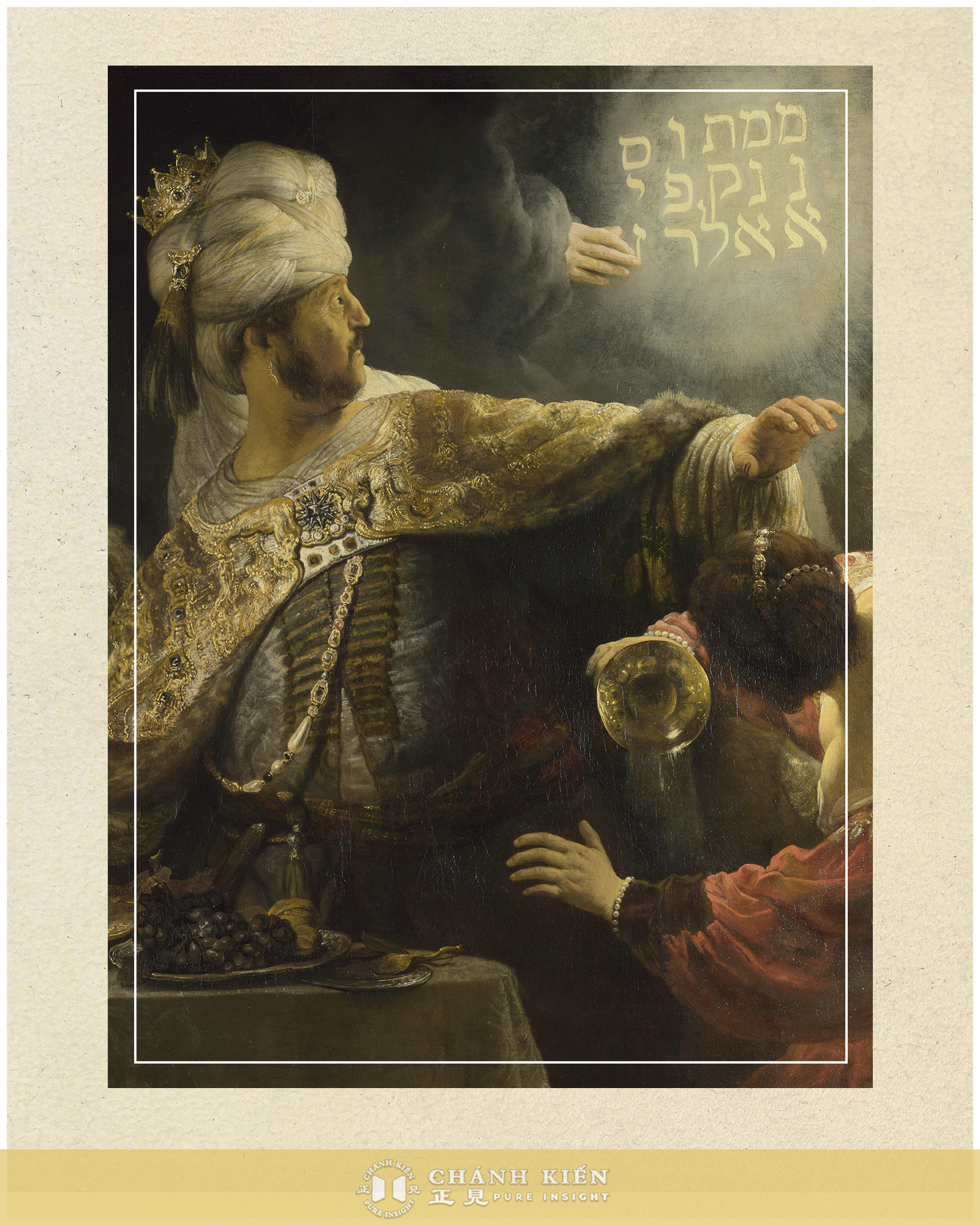 Vào thế kỷ 17, Rembrandt, một họa sĩ tiêu biểu của trường phái nghệ thuật Baroque Hà Lan, ông nổi tiếng về vẽ những câu chuyện lịch sử và kinh thánh, đã vẽ ra cảnh tượng kinh ngạc này dựa trên những ghi chép trong sách Kinh thánh – Daniel: Người hầu gái của Belshazzar đang dùng đồ cướp được trong thánh điện để rót rượu góp vui, đó vốn là những đồ dùng bằng vàng bạc dâng lên Thượng Đế, nhưng Belshazzar chưa kịp thưởng thức thì trên tường đột nhiên xuất hiện bàn tay và dòng chữ bí ẩn, khiến Belshazzar vô cùng kinh hãi và khiếp sợ. Ngụ ý trong tranh là sự phóng túng hưởng thụ tình cảm dục vọng thường chỉ thoáng qua trong giây phút, phồn hoa qua đi, sự phán xét của Thần mới là kết cục sau cùng của sinh mệnh. Đến khi đó, biểu hiện của con người thế gian sẽ trở thành tiêu chuẩn đánh giá; người khiêm tốn, tự giác, thiện lương sẽ đắc phúc báo; kẻ kiêu căng, ngang ngược, phóng túng dục vọng, tàn bạo sẽ chịu ác báo.