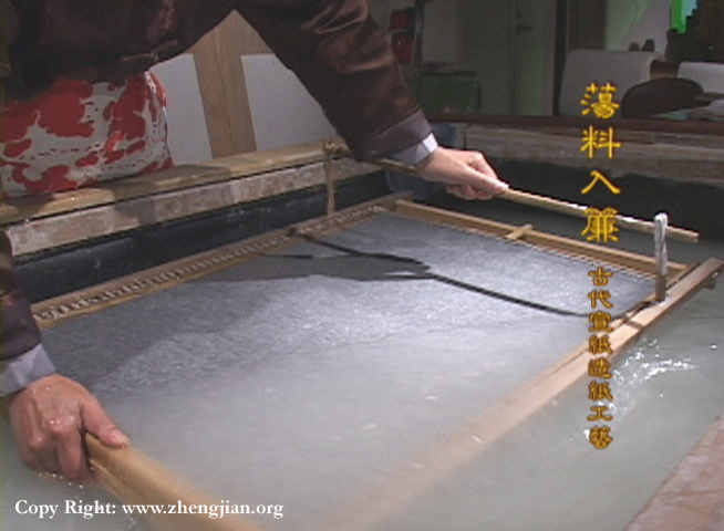 Nghề làm giấy bắt đầu xuất hiện vào thời nhà Tần và nhà Hán. Năm 1973, giấy gai dầu sử dụng vào thời Tây Hán đã được khai quật ở Kim Quan, Cam Túc, Trung Quốc. Tác phẩm “Thiên công khai vật” của Tống Ưng Tinh thời nhà Minh ghi lại quá trình làm giấy ở Trung Quốc cổ đại như sau: Băm nhỏ tre ngâm dưới ao, cho vào nồi nấu sôi đủ lửa, dùng tấm màn nhúng vào nước chứa bột tre, (bột giấy kết thành lớp mỏng bám trên mặt tấm màn), tách lớp giấy ra khỏi tấm màn, đặt tấm gỗ lên trên tờ giấy để ép hết nước, hong khô qua lửa.