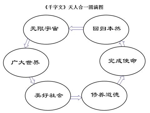 Dưới đây nói về “Sơ đồ Thiên nhân hợp nhất viên mãn của Thiên Tự Văn”. Tất nhiên là sơ đồ này khái quát nội dung của cả quyển, chứ không khái quát theo số lượng chữ, qua sáu mục này, mọi người có thể hiểu được Thiên Tự Văn dạy điều gì. Từ góc trên bên trái xuống, phần thứ nhất là “Vũ trụ vô hạn”, vũ trụ vô hạn sinh ra “Thế giới rộng lớn”, trong thế giới rộng lớn lại bao gồm “Xã hội tốt đẹp”, nhưng ở đây có thể thêm 2 chữ: “Thánh hiền”, tức là xã hội tốt đẹp sẽ là xã hội do Thánh hiền khai sáng.