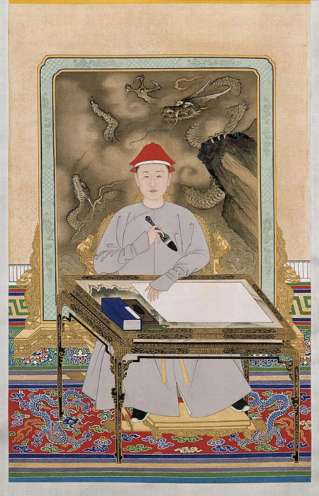 Theo ghi chép lịch sử, phàm là nơi Hoàng đế Khang Hy ngồi, thư tịch đều được xếp thành vòng xung quanh. Hình vẽ chân dung Hoàng đế Khang Hy đang đọc sách năm 1699 (45 tuổi). (Phạm vi công cộng)