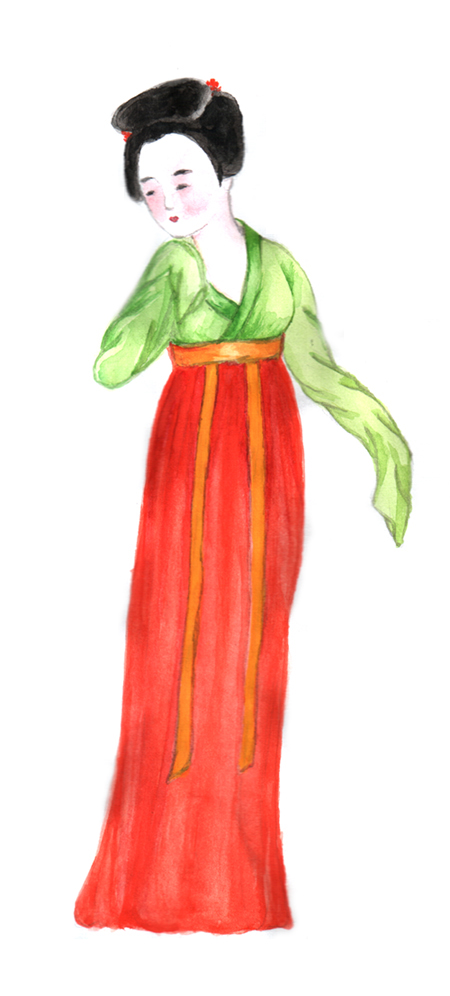 Vào đầu thời Đường, trang phục phổ biến của phụ nữ là áo khoác ngắn với tay áo nhỏ, chiều dài tay áo vừa với chiều dài thân váy, váy dài có eo cao, thường thì váy cao trên eo trở lên, có trường hợp thậm chí eo váy cao đến phần dưới cánh tay và thắt lưng hình nơ quanh eo được quấn bằng dải lụa khiến phụ nữ trông xinh đẹp và thanh mảnh. Thời ấy còn có một loại váy phổ biến gọi là “váy thạch lựu”, do loại váy này được nhuộm bằng màu đỏ tươi rực rỡ như màu thạch lựu nên mới có tên như vậy. Những chiếc váy của phụ nữ thời Đường có kiểu dáng đa dạng, màu sắc lộng lẫy, chất liệu tinh xảo, hoa văn tinh mỹ, tất cả đều đạt đến trình độ cao mà trước nay con người chưa từng đạt được.