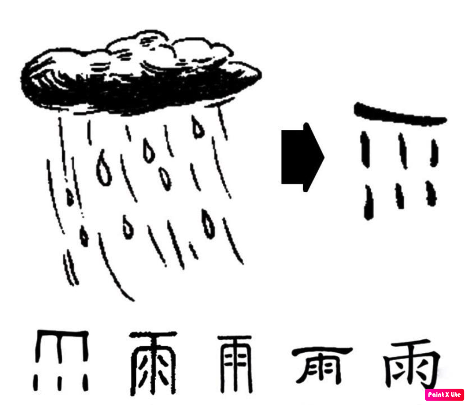 có chữ Nhất 一 đại biểu cho Trời, phần khung phía dưới chữ Nhất là “ㄇ” biểu thị cho mây, bốn dấu “” bên trong đại biểu cho giọt nước rơi xuống, qua đó giải thích rõ rằng mưa rơi xuống từ mây ở trên trời, rất truyền thần, sinh động.