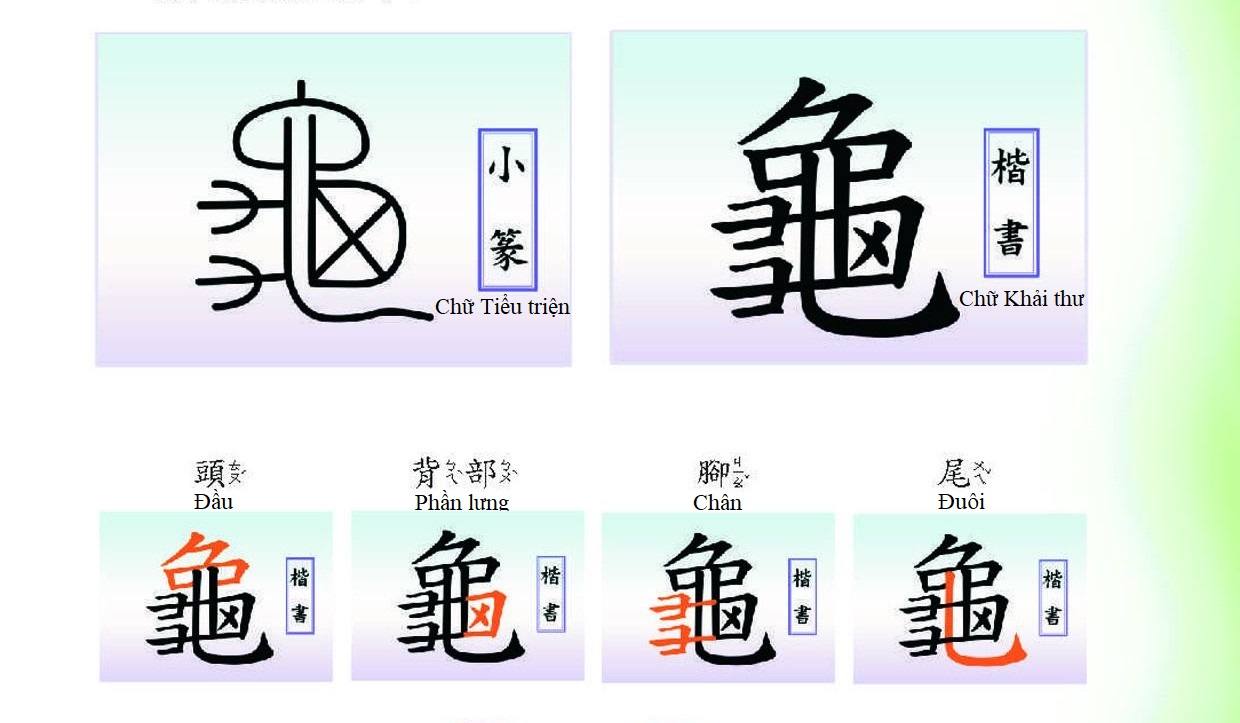 Chữ quy theo kiểu chữ Tiểu triện, trên là phần đầu, phía bên phải là mai rùa, bên trái là chân rùa, bởi vì phía bên cạnh chỉ nhìn thấy hai chân, nên phần dài dài cong cong tựa như cái móc câu ở giữa, chính là cái đuôi của con rùa.